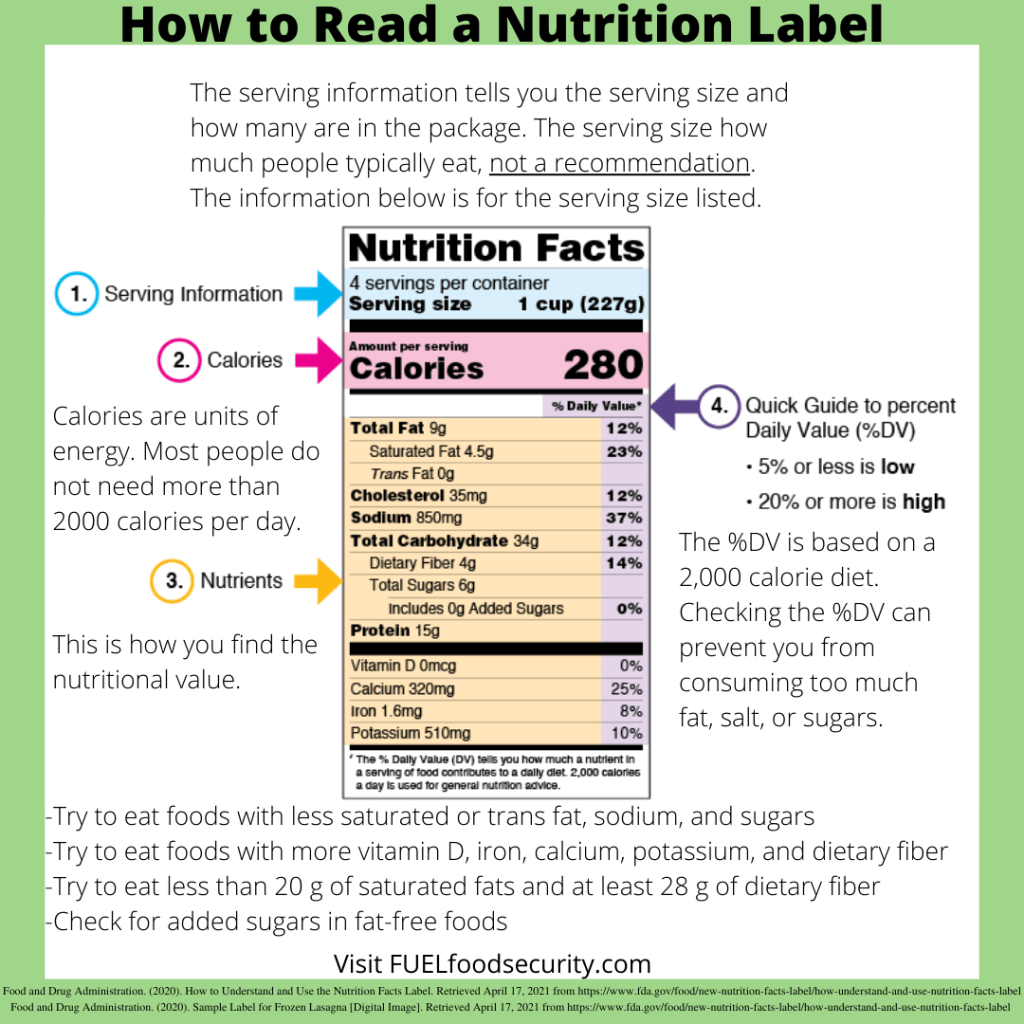 Food and Drug Administration. (2020). How to Understand and Use the Nutrition Facts Label. Retrieved April 17, 2021 from https://www.fda.gov/food/new-nutrition-facts-label/how-understand-and-use-nutrition-facts-label